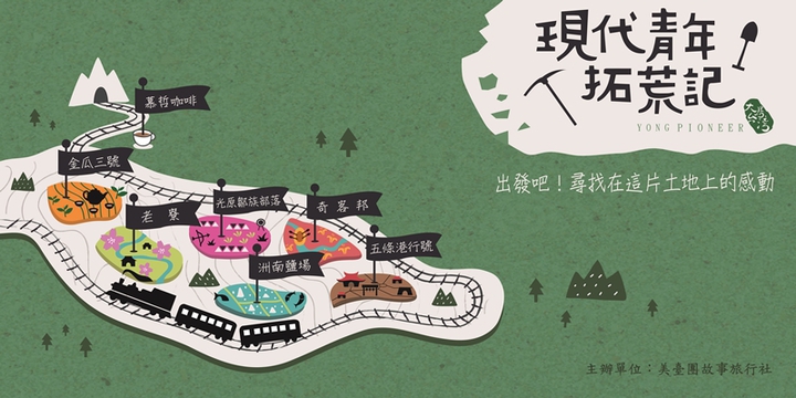 「現代青年拓荒記」活動以拓荒的概念出發,串連6位青年成為拓荒島主。島主所鋪設的二日體驗旅程,是一種冒險,充滿著機會與驚奇,看似熟悉的環境,卻藏著陌生的味道。不管是把自已放在梯田中、鹽田裡、老街上、桐樹叢,途中所見到的笑容與對談的話語,都讓你遇見那生活中在地的美好幸福。